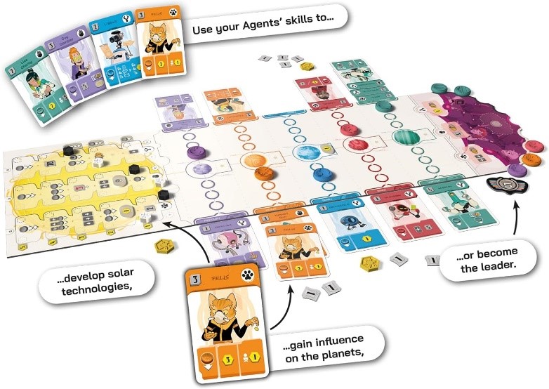On joue soit seul, soit par équipe de deux et le but est de tirer les planètes vers soi pour les faire sortir du plateau à la façon du jeu de « tir à la corde ». Les cartes avec des bonus plus ou moins puissants vont nous aider à descendre plus vite ou bien à gagner des ressources. Il y a sur le plateau 3 pistes d’évolution sur lesquelles on peut gagner encore plus de bonus. Nous pouvons gagner de 3 façons différentes. C’est un jeu riche qui nous oblige à regarder partout et à collaborer avec notre partenaire si on joue en équipe. J’aime le dynamisme du jeu, le thème spatial du jeu , les nombreuses interactions entre les joueurs et le fait que tout peut basculer jusqu’au dernier moment ! Coup de cœur de mes jeux préférés de 2025.
